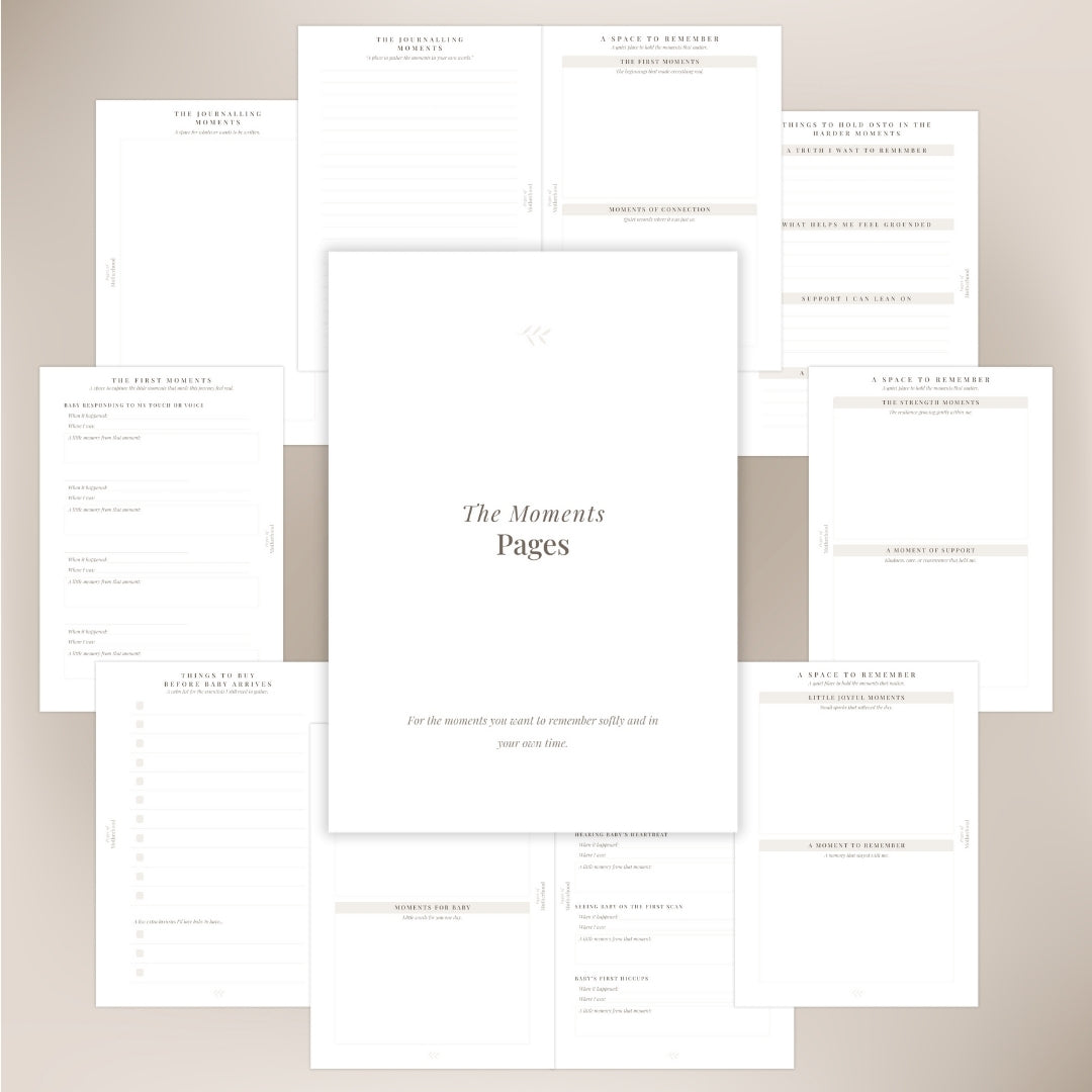 The Moments Pages are a beautifully curated extension to your Pages of Pregnancy journal, created for those who want more space to capture the emotional, memorable, and life-shaping parts of this season. These pages hold the little details, the firsts, the shifts in your heart, and the memories that deserve to be preserved with calm intention.